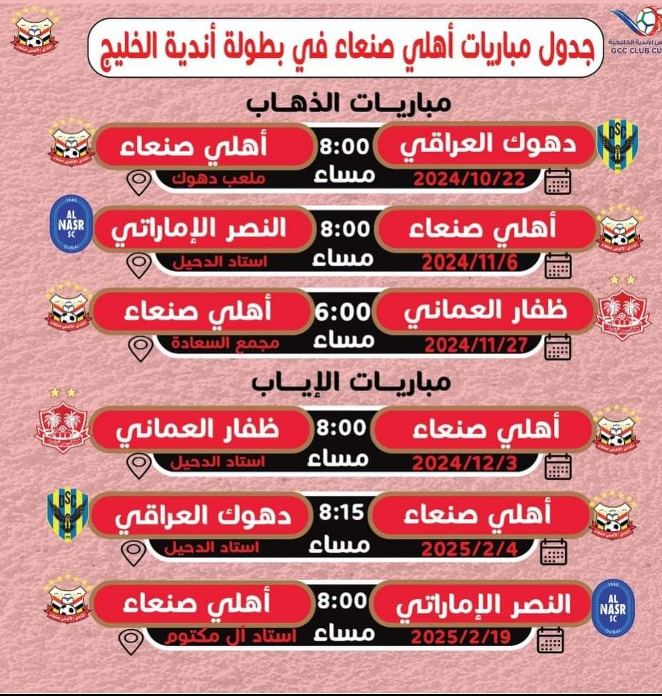 شاهد جدول مباريات إمبراطور أهلي صنعاء مع الأندية الخليجية