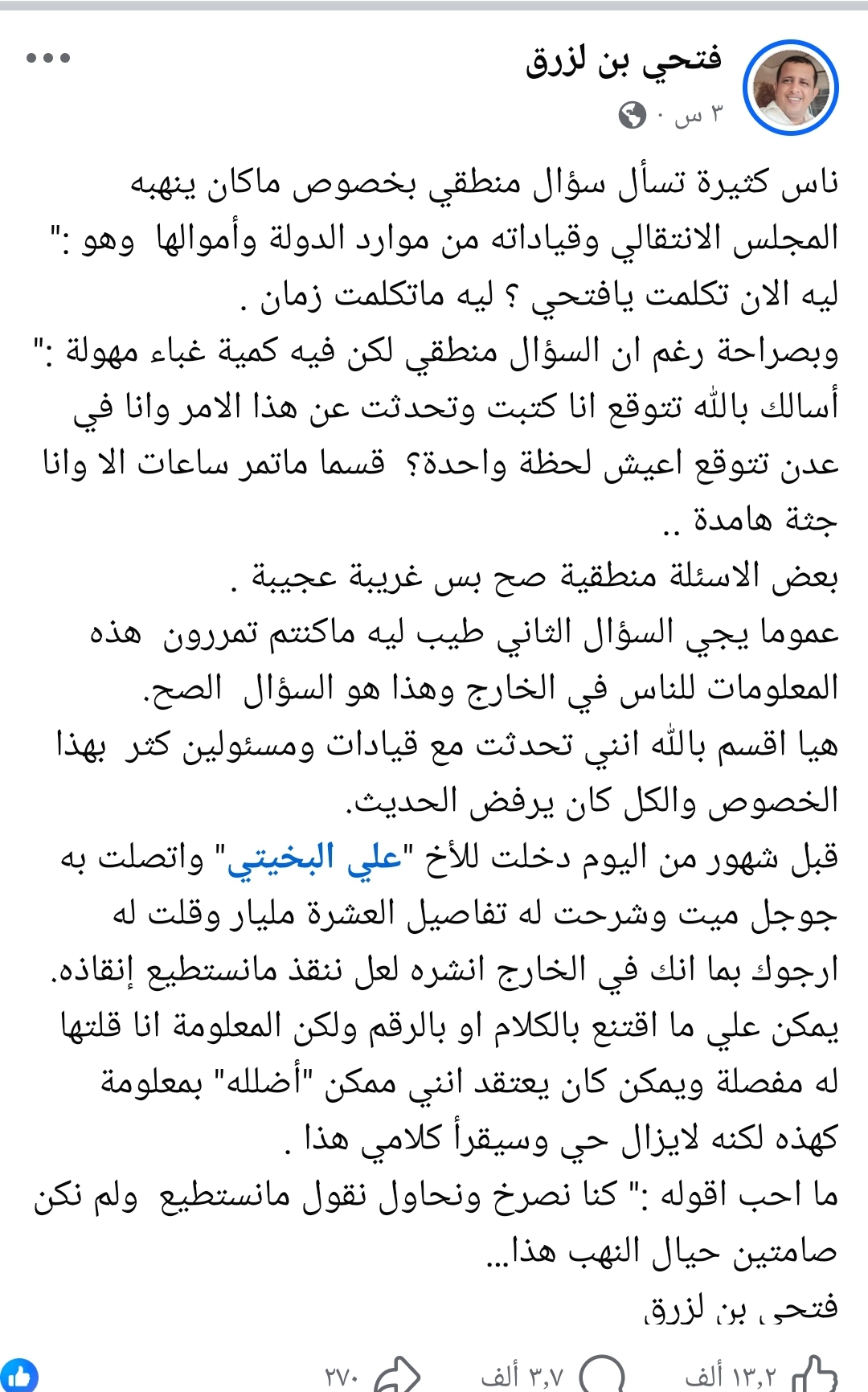 أعاد الصحفي فتحي بن لزرق فتح ملف شائك ظل حاضرًا في الكواليس وغائبًا عن العلن لسنوات، يتعلق باتهامات فساد ونهب موارد عامة منسوبة لقيادات في المجلس الانتقالي الجنوبي بعدن، وذلك من خلال توضيح علني فسّر فيه أسباب صمته السابق، وتوقيت حديثه الحالي.