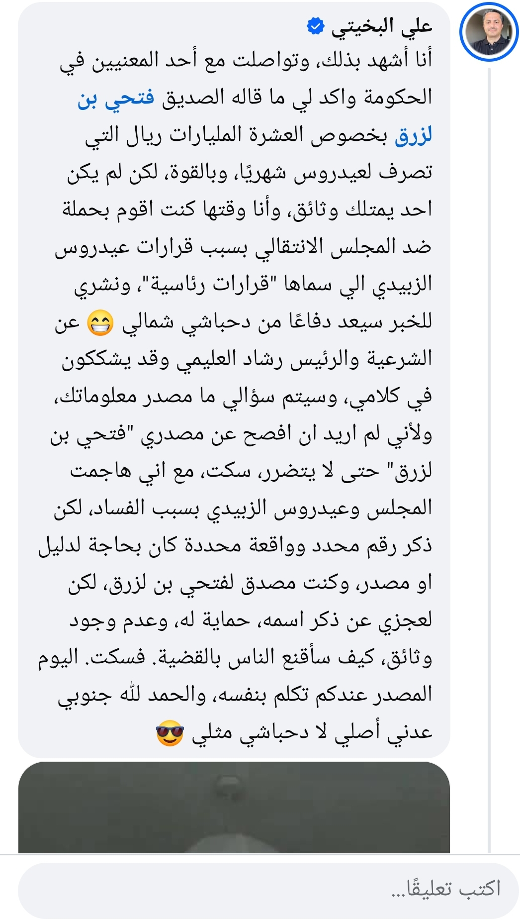 ردّ علي البخيتي، الذي رصده موقع الأوراق برس، قدّم زاوية مكملة للرواية، إذ أكد صحة ما نقله بن لزرق، مشيرًا إلى أنه تحقّق من المعلومة عبر التواصل مع أحد المسؤولين الحكوميين.
