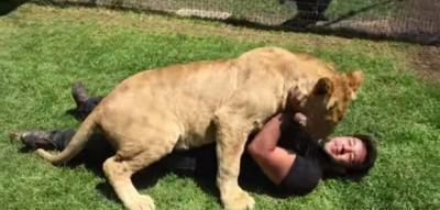 وظهرت اللبؤة “كيارا” في الفيديو، وهي تنتظر الرجل في الفناء وتحمست بشكل رائع عندما رأته أمامها؛ حيث عبرت عن سعادتها البالغة بمعانقته وتقبيله حتى أسقطته على الأرض، وظلت اللبؤة متشبثة بيديه وقدميه لعدة دقائق.