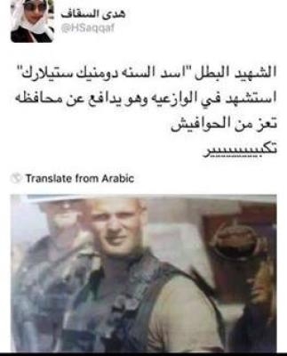 في الوفت  الذي  نعت شركة بلاك ووتر تمصرع الجنرال الكولومبي المتقاعد " دومنيك ستيلارك" في ما تُسّمى ( معركة تحرير تعز) وسط اليمن !في شبكة فوكس نيوز الاميركية، والانبدندنت البريطانية، غيران الغريبة ان من يصفون انفسهم بالمقاومة من حزب الاصلاح اليمني الاسلامي اخوان مسلمين يعتبرونه شهيدا  بينما يعتبرون من يقتل  من الاطفال والنساء على يد طائرات العدوان  مجرمين  وعلق البعض هذا واحد من الصحابه الوهابيين الجُدد. كم حور سيكون له في جنة بني وهبون؟ سأسأل المفتي الأعور لتكفيريي بني سعود فهذا شيئ جديد على الإسلام أن يكون معنا صحابه من كولومبيا، ما أدري باي لُغه با يكلِّم الملائكه، أسباني أو إنجليزي؟