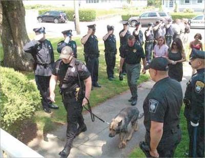 في مدينة بليموث التابعة لولاية ماساتشوستس الأميركية، اصطف نحو 20 ضابط شرطة وأدوا التحية العسكرية لكلب من كلاب الاثر خلال مراسم وداعية رسمية أقيمت قُبيل إعدامه لإراحته من آلام مرض الفشل الكلوي الذي استعصى على الاطباء علاجه.