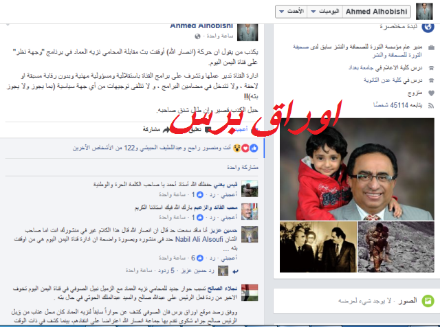 مصدر مقرب من نبيل الصوفي اوضح لـ"اوراق برس " ان حركة" انصارالله" لم توقف اي برنامج حتى الان للزميل الصوفي وفق تصريحاته السابقة الاتىنشرها موقع اوراق برس، وانما حدث اعتراض سابقاً العام الماضي ، وهناك تحفظ على بث المقابلة الجديدة..