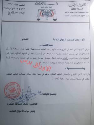 ووفق مذكرة صادرة عن " وكيل نيابة الأموال العامة في أمانة العاصمة صنعاء القاضي مطهر عبدالله الجمرة إلى مدير مباحث الأموال العامة يطالبه بتنفيذ أمر إحضار المتهم " عبدالعظيم أحمد دغسان " تنفيذاً لقرار محكمة الأموال العامة بالأمانة في جلساتها المنعقدة بتاريخ 23 إبريل 2024م المتضمنة احضار المتهم المذكور قهراً للمحكمة وايداعه الحبس.