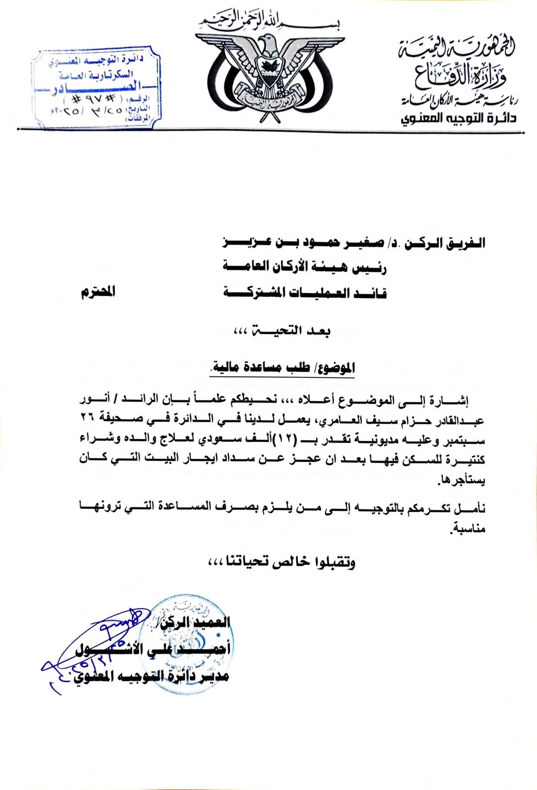 لرئيس هيئة الأركان الفريق صغير بن غزيز، فرفعها لفخامة النائب سلطان العرادة والذي ضاعت في أدراجه ولم تخرج الى النور منذ أكثر من شهر، وكان بن عزيز قادر أن يصرف لنا مساعدة ويعتبرني من عمران مثل المساعدات التي يصرفها لأصحاب بلاده بالهبل.