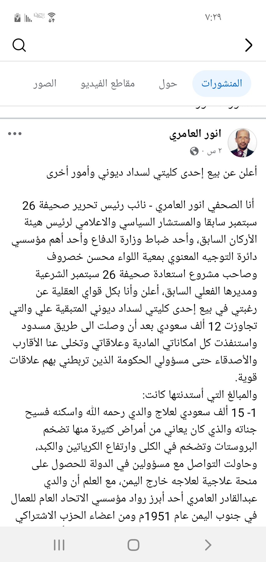 الصحفي انور العامري - نائب رئيس تحرير صحيفة 26 سبتمبر سابقا والمستشار السياسي والاعلامي لرئيس هيئة الأركان السابق، وأحد ضباط وزارة الدفاع وأحد أهم مؤسسي دائرة التوجيه المعنوي بمعية اللواء محسن خصروف وصاحب مشروع استعادة صحيفة 26 سبتمبر الشرعية ومديرها الفعلي السابق، أعلن وأنا بكل قواي العقلية عن رغبتي في بيع إحدى كليتي لسداد ديوني المتبقية علي والتي تجاوزت 12 ألف سعودي بعد أن وصلت الى طريق مسدود واستنفذت كل امكاناتي المادية وعلاقاتي وتخلى عنا الأقارب والأصدقاء حتى مسؤولي الحكومة الذين تربطني بهم علاقات قوية.
