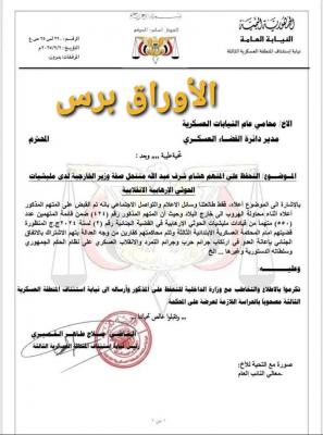 المذكرة، الموقعة من رئيس النيابة العسكرية القاضي صلاح طاهر القنبري، وُجهت إلى محامي عام النيابات العسكرية ومدير دائرة القضاء العسكري، وتضمنت طلبًا بالتنسيق مع وزارة الداخلية التابعة لعدن لضبط المذكور وإحالته مع الحراسة إلى المحكمة العسكرية المختصة.