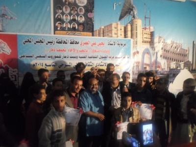 هذا في ما تخلل الحفل عدد من الفرات الفنية الثقافية والمسرحية بعدة الوان التي زينت الحفل وجماليتة وكذالك ضيوف الشرفوفي ختام الحفل تم تكريم عدد من المبرزين بالمحافضة من الطلاب ااوئل بالمحافظة التي تم أستهافهم من خلال دورة تدريبية تم من خلالها رفع وتعزيز قدراتهتم في التنمية .