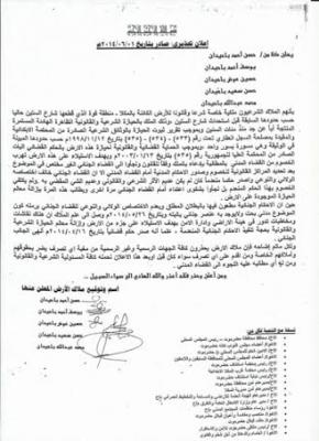 واختتم آل باحيدان بلاغهم بالقول "إن ملاك الارض يحذرون كافة الجهات الرسمية وغير الرسمية من مغبة اي تصرف يضر بحقوقهم وأملاكهم الخاصة ومن اقدم على اي تصرف سواء كان قبل اوبعد هذا الاعلان التحذيري نحمله كافة المسئولية الشرعية والقانونية ومن له أي مطالبه عليه اللجوء الى القضاء المدني ومن أعلن وحذر فقد أعذر والله الهادي الى سواء السبيل .