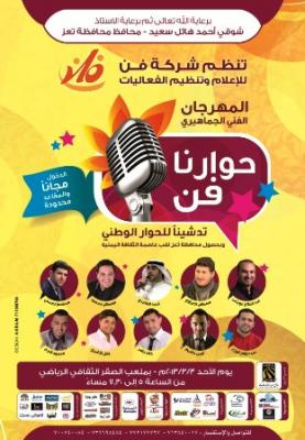 ينطلق غداً الأحد بمحافظة تعز المهرجان الفني الجماهيري “حوارنا فن” والذي سيشارك فيه كوكبة من نجوم الإنشاد اليمني والعربي.. المهرجان يأتي ضمن المشاركة الفعالة للفنون ومبدعيها في خدمة قضايا الوطن والمجتمع، خلال هذه الأيام التي تعيشها اليمن استعداداً لمؤتمر الحوار الوطني الشامل الذي سيدشن في 18 مارس الجاري.